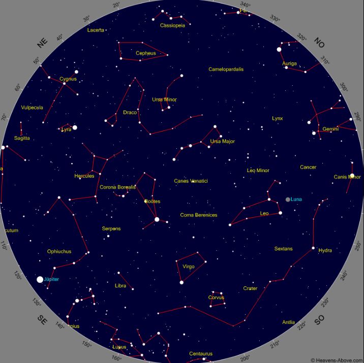 Ha llegado la primavera, nuevas constelaciones y planetas surcan el firmamento en las noches estrelladas de Abril. Hablemos un poco de las constelaciones y objetos interesantes que podemos ver este mes. Vamos a elegir una hora estándar para nuestra observación en el hemisferio norte, elegimos el día 15 de abril a las 02h, y para 40º latitud Norte. Ahora veamos que nos depara este precioso cielo: