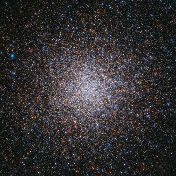 Esta imagen del telescopio espacial Hubble del núcleo de M 2 se creó con luz visible e infrarroja. La mayor parte de la masa del cúmulo se concentra en su centro, con brillantes corrientes de estrellas que se extienden hacia el espacio exterior. Créditos: telescopio espacial Hubble