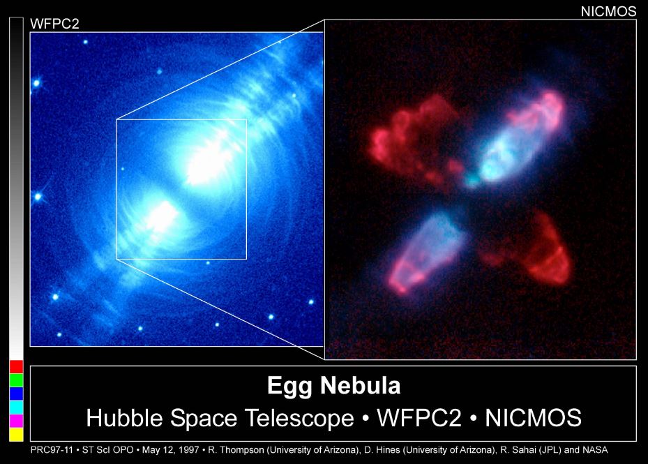 La siguiente imagen obtenida por el instrumento NICMOS (Near Infrared Camera and Multi-Object Spectrometer), a bordo del Telescopio espacial Hubble, muestra aun más detalles de la nebulosa, se puede observar una gruesa zona de polvo que rodea la estrella central de ahí se observa claramente una envoltura gaseosa. Esta imagen en infrarrojo está codificada en falso color para destacar dos tipos diferentes de emisión. El color rojo representa el hidrógeno calentado por las colisiones de las envolturas que están en expansión. El color azul es la luz de la estrella central capturada por el polvo de la nebulosa