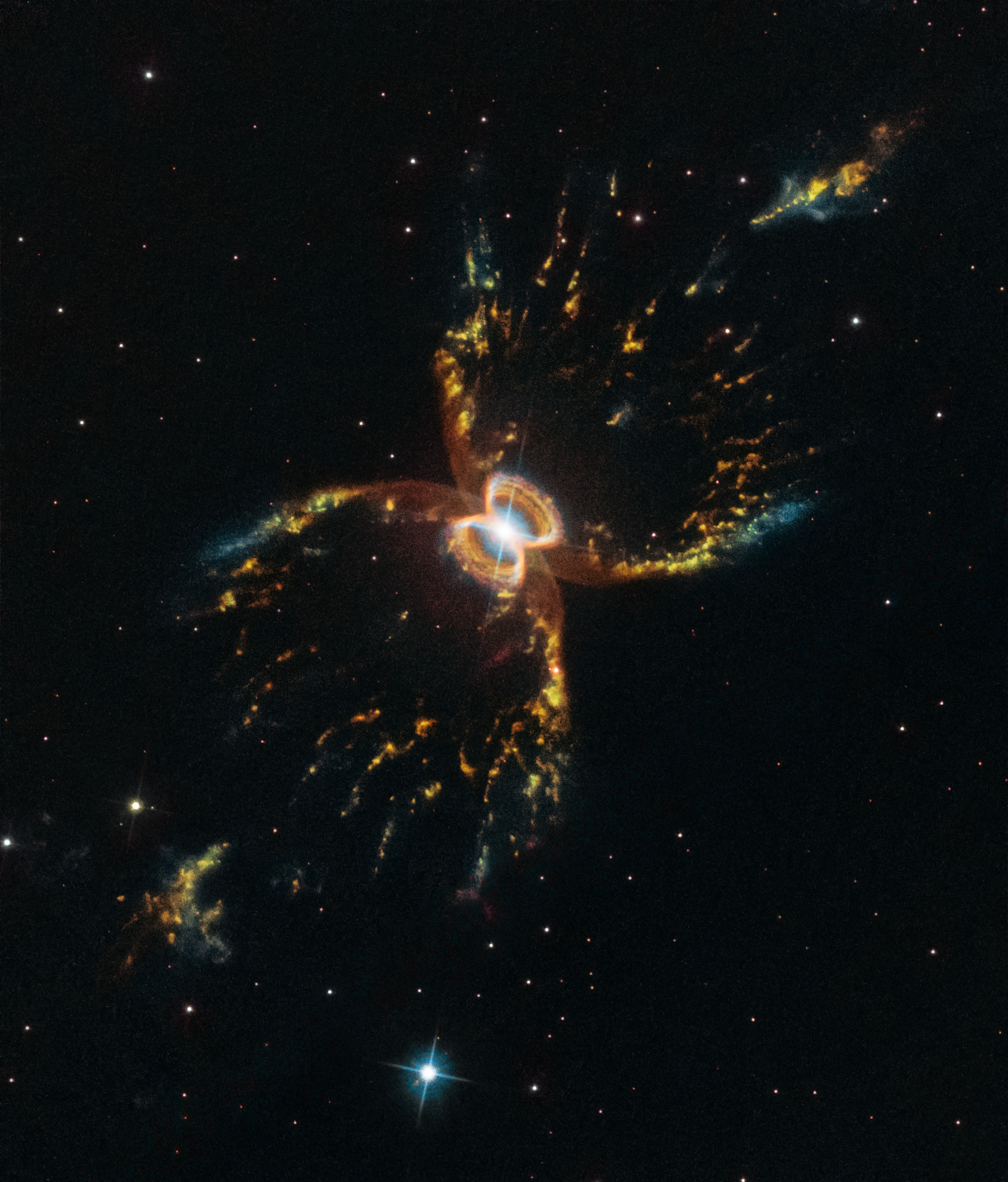 Esta preciosa nebulosa, que exhibe unas tremendas estructuras anidadas, se ha creado por la interacción entre un par de estrellas muy viejas ubicadas en su centro, una es una estrella gigante roja fría y la otra una estrella enana blanca muy caliente. La gigante roja está perdiendo sus capas externas mediante un poderos viento estelar y parte de ese material expulsado es atraído por la gravedad de su compañera enana blanca que se está retroalimentando de la otra estrella. Cuando una cantidad suficiente de este material cae sobre la enana blanca, también expulsa el material hacia afuera en una erupción, creando las estructuras curiosas que vemos en la nebulosa.