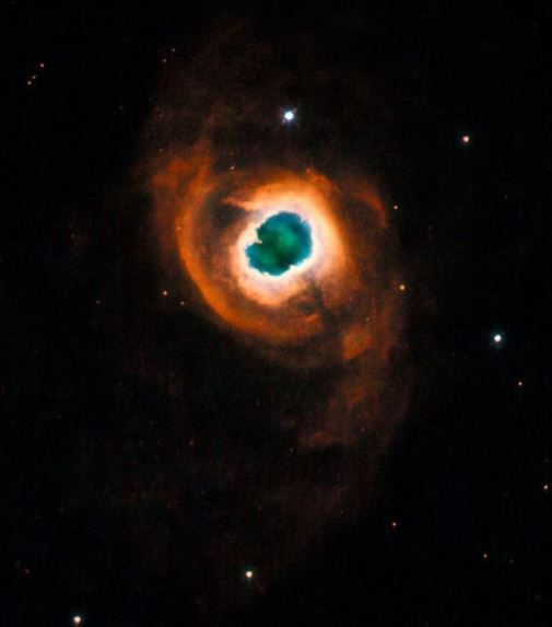 Una nebulosa planetaria se forma a partir de material en las capas externas de una estrella gigante roja que fue expulsado al espacio interestelar cuando la estrella estaba en las últimas etapas de su vida. La radiación ultravioleta emitida desde el núcleo caliente restante de la estrella ioniza las cáscaras de gas expulsadas, lo que hace que brillen. El final será la aparición de una estrella enana blanca. En unos 5000 millones de años nuestra estrella, el Sol, pasará por esta misma situación. Ocurrirá siguiendo los siguientes pasos: