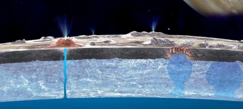 Con base a los datos de la sonda Galileo adquiridos durante su exploración del sistema joviano entre 1995 a 2003, se determinó que la luna Europa posee un profundo océano global de agua líquida bajo una capa de hielo en su superficie. Este océano bajo su superficie helada podría oscilar entre 80 y 170 kilómetros profundidad media.