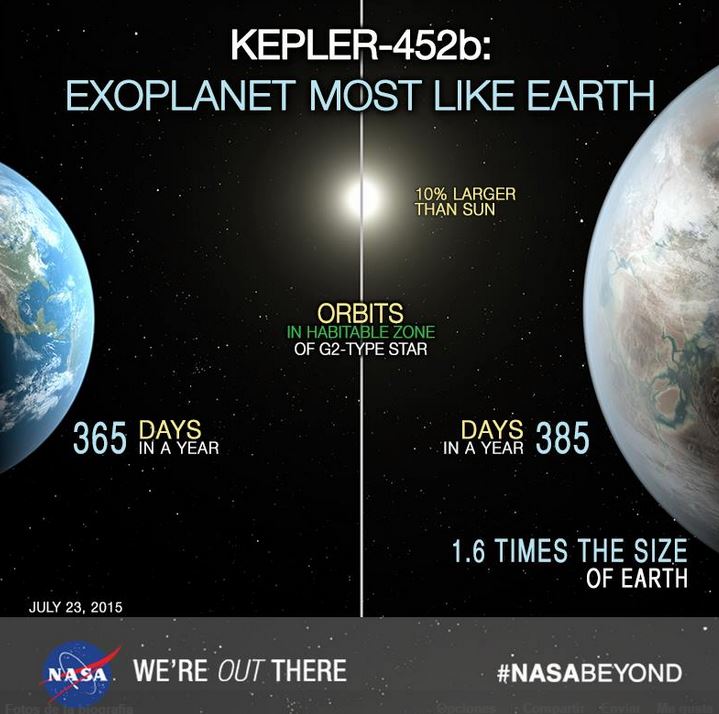 Otro exoplaneta interesante es Kepler-452b, es el más parecido de los encontrados hasta el momento a nuestro sistema Tierra-Sol. En la figura siguiente podemos ver una representación artística de varios planetas descubiertos por el telescopio espacial Kepler y que se encuentran en la zona de habitabilidad y con similitudes a nuestro planeta la Tierra: de izquierda a derecha, Kepler-22b, Kepler-69c, el recién anunciado Kepler-452b, Kepler-62f, Kepler-186F y la Tierra: