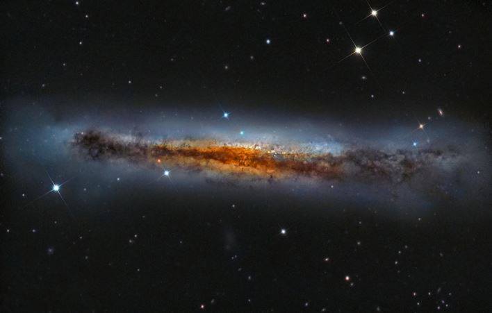 Esta magnifica imagen es el canto de la galaxia espiral NGC 3628 (también llamada galaxia Hamburguesa por su curiosa forma) la imagen muestra un hinchado disco galáctico dividido por franjas de polvo oscuro.
