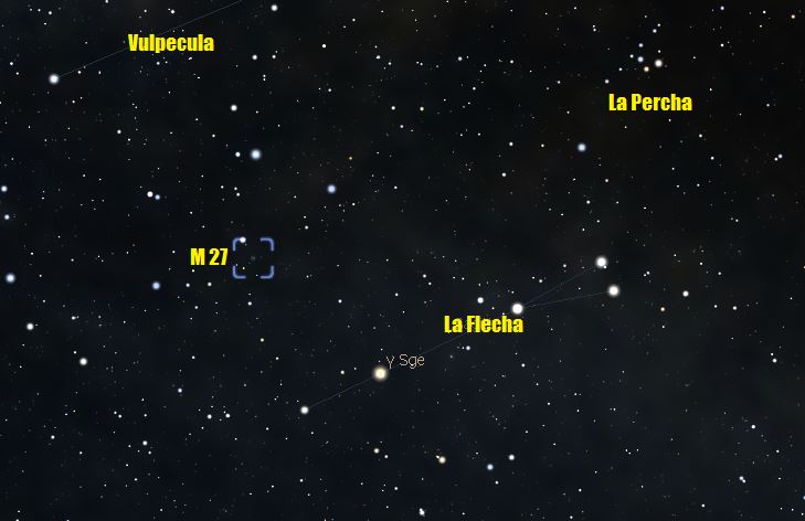 Para encontrarla con prismáticos o pequeños telescopios sin seguimiento automático no tenemos más que buscar la constelación de Sagitta (la flecha) y justo encima de ella la podemos encontrar, pero en la siguiente imagen lo veréis mucho mejor: