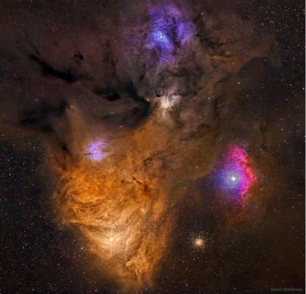 Rho Ophiuchi es una estrella multiple, podemos ver hasta cuatro estrellas muy juntas con pequeños telescopios, esta se encuentra en el centro de la nebulosa azul cerca de la parte superior de la imagen.