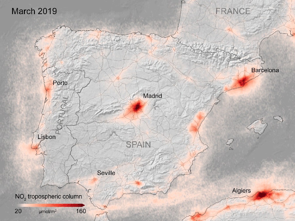 Otra zona de la Tierra donde se puede observar esto es sobre la península ibérica, en España se ha realizado un confinamiento total, de los más duros del mundo y el resultado es también espectacular. Las grandes ciudades han bajado de manera impresionante esa contaminación.