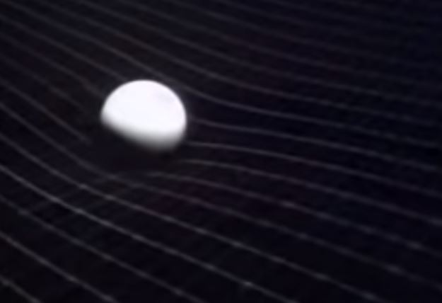 Supongamos una superficie plana bidimensional, por ejemplo una sábana que tengo cogida en el aire, ahora cogemos una pelota y la dejamos sobre la sábana, veremos que la superficie se distorsiona y se pliega en una tercera dimensión con la acción de la pelota. Como veis en la siguiente imagen: