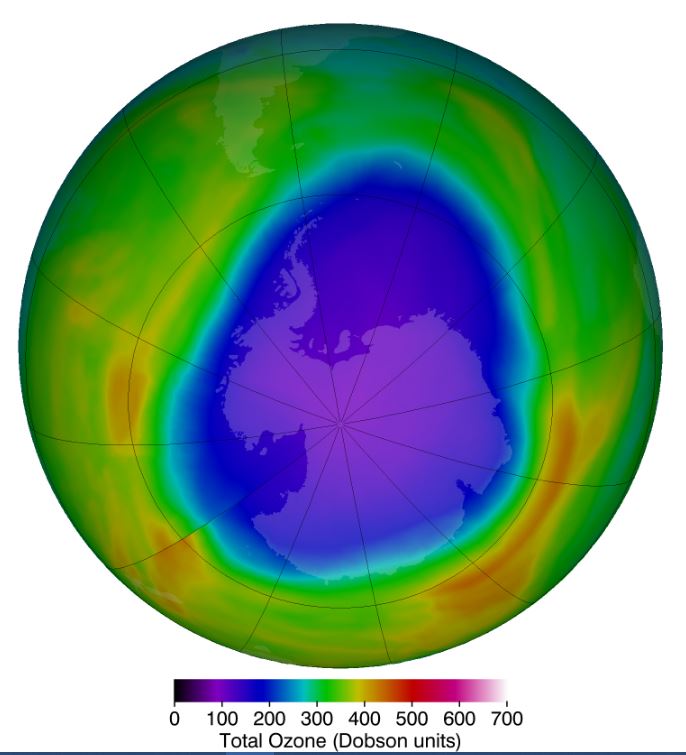 El agujero de ozono es la zona de la estratosfera situada sobre la Antártida, con valores de ozono por debajo de unas 200 DU.