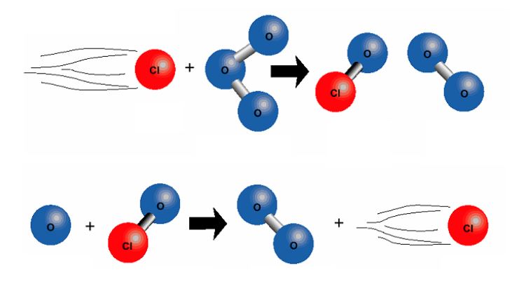-La reacción previa a dicha destrucción es la separación del ion cloro de la molécula de CFC, por medio de la acción de la radiación ultravioleta. Una vez libre el ion cloro la reacción de destrucción de ozono es catalítica, es decir, el Cl− se recupera al final del proceso, y esta dispuesto para destruir otra molécula de ozono: