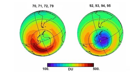 El agujero de ozono apareció a principios de los años 80 del siglo pasado. Si comparamos una imagen promedio de los años 70 con otra de los 90, vemos lo bruscos que han sido su aparición y su reforzamiento a finales del pasado siglo.