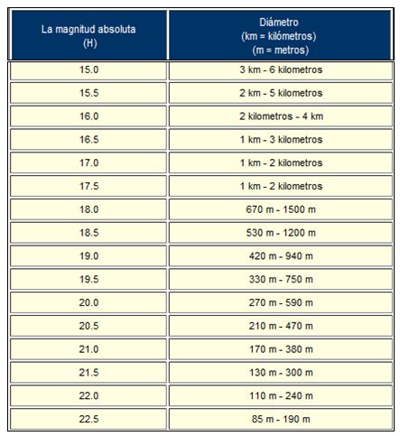 A partir de la magnitud y del albedo del asteroide se puede dar un rango de tamaños para este. Ya que el albedo no se conoce exactamente se toma por definición un albedo estándar de entre 0.25 a 0.05. A partir de ahí se obtiene para cada magnitud una tabla de rangos aproximados de diámetros de asteroides. Como podemos ver en la siguiente tabla  a modo de ejemplo.