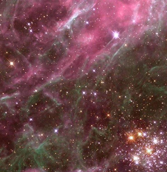Muchas de las estrellas del cúmulo Hodge 301 ya han explotado como supernovas, lanzando material hacia afuera a velocidades de casi 250 kilómetros por segundo. Este material se está lanzando hacia la Nebulosa de la Tarántula impactando y comprimiendo el gas en una multitud de láminas y filamentos espectaculares, que se ven en la parte superior izquierda. Hodge 301 también contiene tres supergigantes rojas: estrellas que están cerca del final de sus vidas y están a punto de convertirse en supernovas.