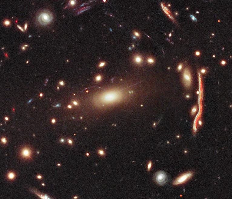 El cúmulo MACS 1206 está compuesto por muchas galaxias y proyecta la imagen de una galaxia de fondo amarillo-rojo en el enorme arco de la derecha. Una inspección cuidadosa de la imagen revela al menos otras galaxias en el fondo, muchas de las cuales aparecen como mechones alargados. El grupo de primer plano solo puede crear arcos tan suaves si la mayor parte de su masa es materia oscura distribuida suavemente y, por lo tanto, no se concentra en el cúmulo de galaxias visibles. El análisis de las posiciones de estos arcos gravitacionales también les da a los astrónomos un método para estimar la distribución de la materia oscura en los cúmulos de galaxias e inferir a partir de eso cuándo comenzaron a formarse estos enormes conglomerados de galaxias.