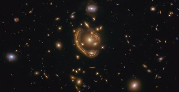 Einstein teorizó por primera sobre estos anillos en su famosa teoría general de la relatividad, la forma inusual de este objeto puede explicarse mediante un proceso llamado lente gravitacional, que hace que la luz que brilla desde lejos sea doblada y atraída por la gravedad de un objeto entre su fuente y el observador. La gravedad provoca una desviación de la luz por el campo gravitacional de un cuerpo masivo. En este caso, una galaxia dobla la luz que emana de una galaxia que está directamente detrás de ella, enfocando la luz que de otro modo sería divergente en un anillo visible.En este caso, la luz de la galaxia de fondo se ha distorsionado en la curva que vemos por la gravedad del cúmulo de galaxias que se encuentra frente a ella. La alineación casi exacta de la galaxia de fondo con la galaxia elíptica central del cúmulo, vista en el medio de esta imagen, ha deformado y ampliado la imagen de la galaxia de fondo a su alrededor en un anillo casi perfecto.