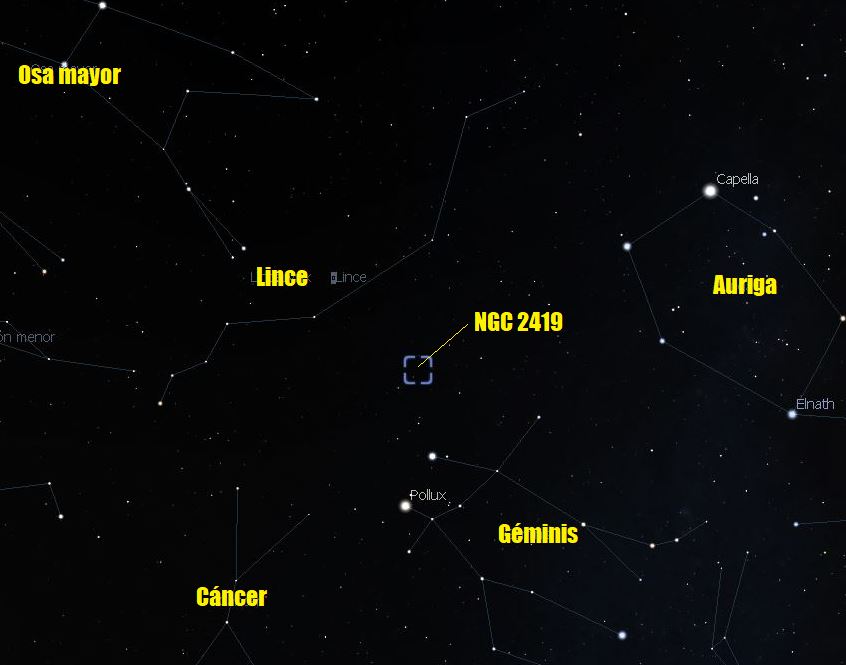 Ubicación de NGC 2419 en el firmamento, puede observarse curiosamente junto con dos estrellas brillantes, y es observable con telescopios de aficionado.