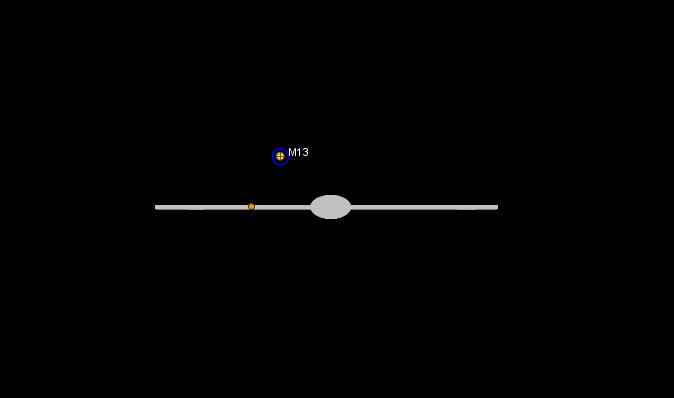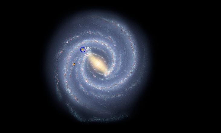 Vista de M13 con respecto al plano de la galaxia, los cúmulos globulares están orbitando continuamente nuestra galaxia, son estrellas muy viejas que no llegaron a adherirse a la vía láctea,