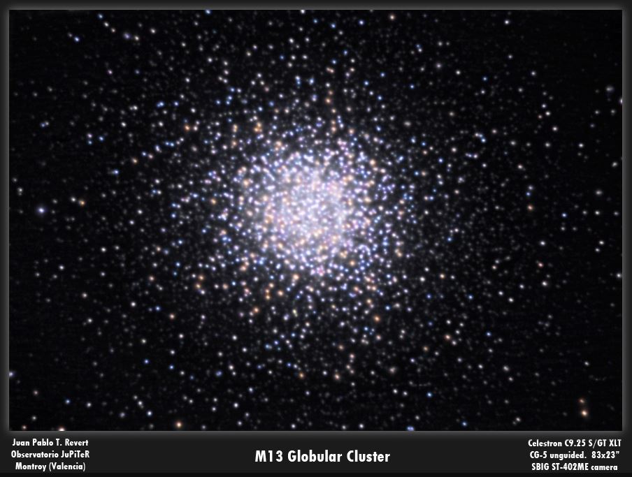 • Pues uno de los más espectaculares que podemos observar en nuestra galaxia es el cúmulo globular M3, que se encuentra a 33.000 años luz de nosotros y contiene entorno a 500.000 estrellas.