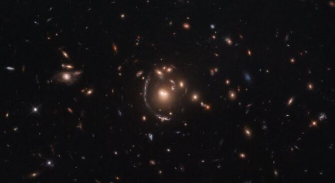 - Noviembre: esta imagen del Hubble muestra la galaxia LRG-3-817. La apariencia de la galaxia está distorsionada por los efectos de las lentes gravitacionales y es visible como un arco largo a la izquierda del cúmulo de galaxias central: