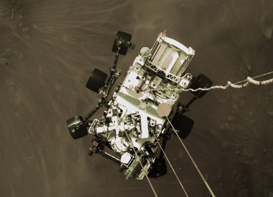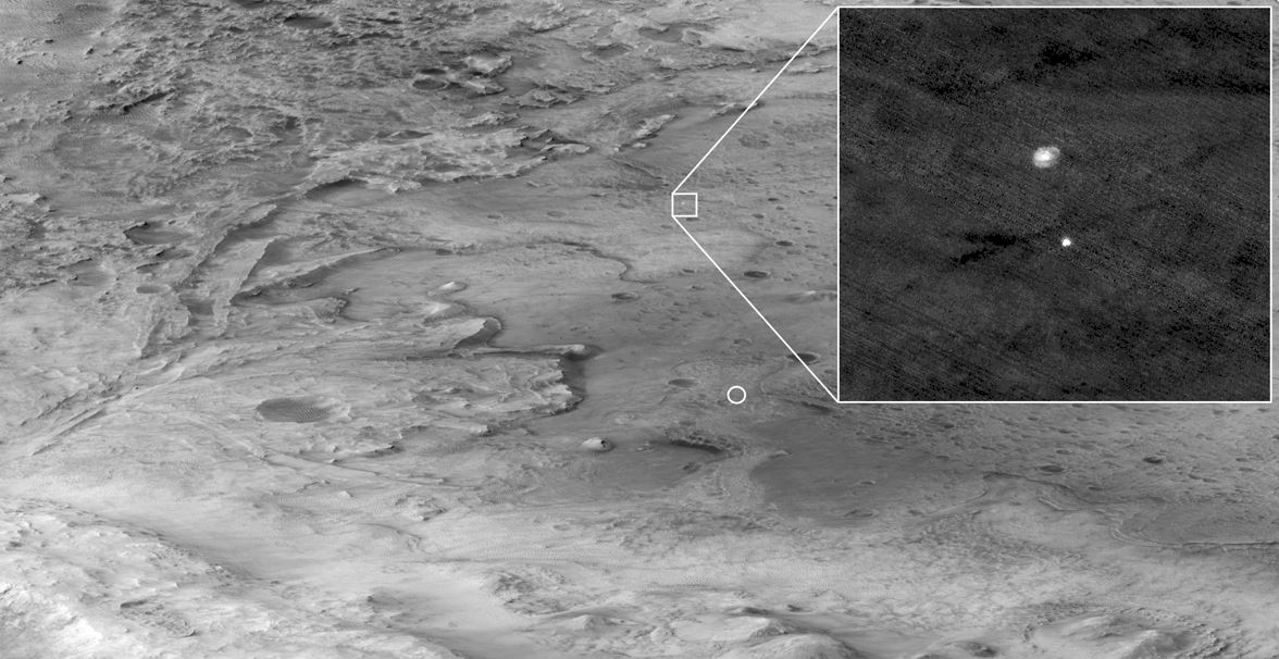 En la siguiente imagen se puede ver la etapa de descenso que sostiene el rover Perseverance cayendo a través de la atmósfera marciana, con su paracaídas detrás. La imagen fue tomada el por la cámara del Experimento de imágenes de alta resolución (HiRISE) a bordo del Mars Reconnaissance Orbiter. El antiguo delta del río, que es el objetivo de la misión Perseverance, se puede ver entrando en el cráter Jezero desde la izquierda.
