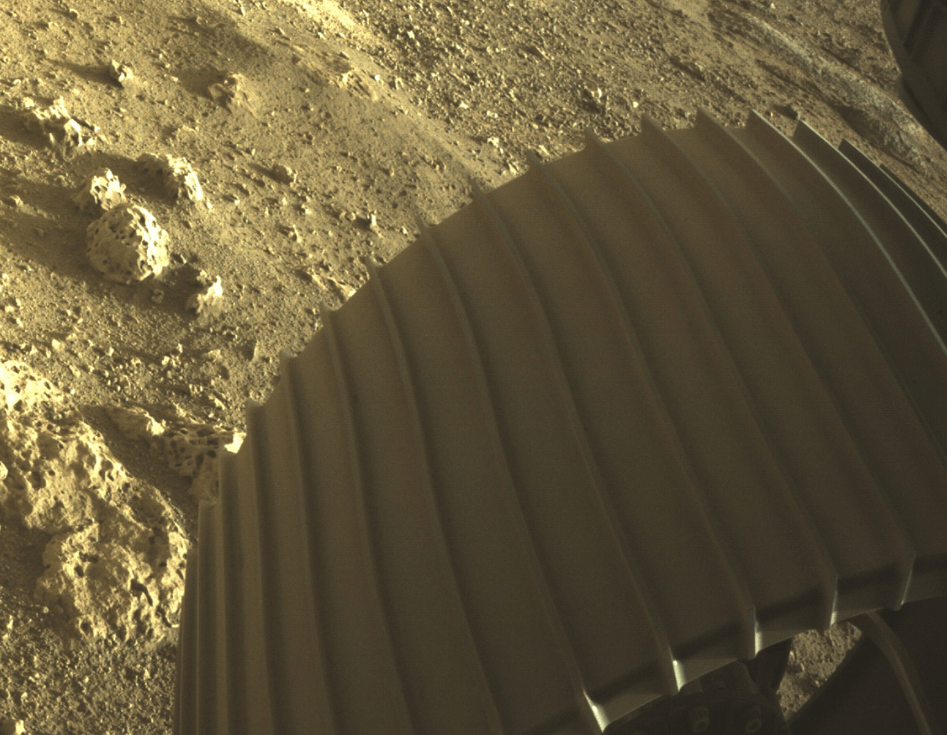 Esta otra imagen de alta resolución muestra una de las seis ruedas a bordo del rover Perseverance. La imagen fue tomada por una de las cámaras a color de Perseverance (Hazcams):