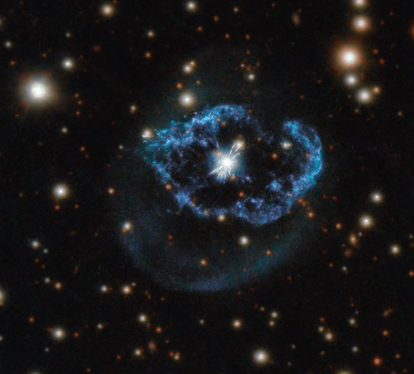 Aunque el núcleo de la estrella ha dejado de quemar hidrógeno y helio, una fuga termonuclear en su superficie expulsa material a altas velocidades. Esta eyección golpea y barre el material de la vieja nebulosa, produciendo los filamentos y la capa irregular alrededor de la estrella central que se ve en esta imagen, que presenta datos de la cámara de campo amplio 3 del Hubble y PANSTARSS.