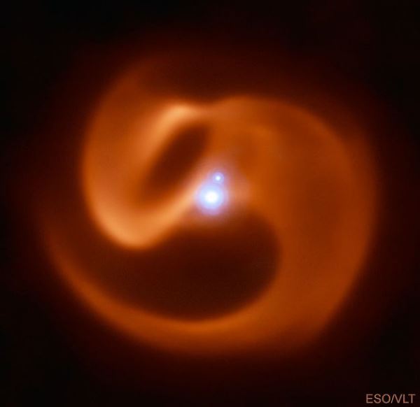 Los remolinos serpentinos que rodean las estrellas están formados por la colisión de dos conjuntos de poderosos vientos estelares, que crean las dramáticas columnas de polvo. Apep es un sistema de estrellas triples que contiene la binaria Wolf-Rayet de la imagen y una supergigante caliente, el sistema estelar está ubicado en la constelación de Norma a unos 7000 años luz de distancia. Nombrado en honor a la deidad serpiente de la mitología egipcia.