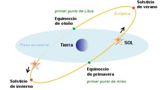 Posición de la Tierra en el equinoccio de Otoño, el Sol está aparentemente en ese momento en el punto de Libra punto corte con el plano ecuatorial de la Tierra con el plano de la eclíptica.