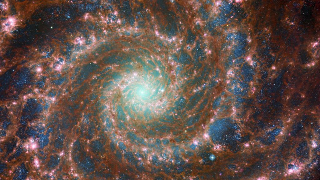 En la constelación de Piscis podemos observar una galaxia impresionante, la galaxia espiral M74, que se encuentra a 32 millones de años luz de nosotros, es muy débil para observarla con telescopios de aficionado, pero aquí tenéis una imagen de esta esplendida galaxia obtenida desde el telescopio espacial James Web:
