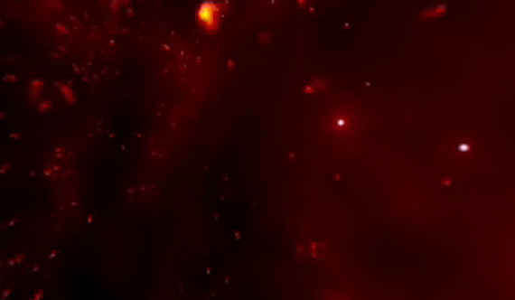 Desde el punto de vista del agujero negro supermasivo de la Vía Láctea, llamado Sagitario A (Sgr A*), se pueden observar alrededor de 25 estrellas Wolf-Rayet (objetos blancos centelleantes) mientras expulsa continuamente vientos estelares (escala de color negro a rojo a amarillo). Estos vientos chocan entre sí, y luego parte de este material (manchas amarillas) gira en espiral hacia Sgr A*. El vídeo muestra dos simulaciones, cada una de las cuales comienza alrededor de 350 años en el pasado y abarca 500 años. La primera simulación muestra al agujero supermasivo en estado de calma, mientras que la segunda lo muestra más violento y expulsando material.