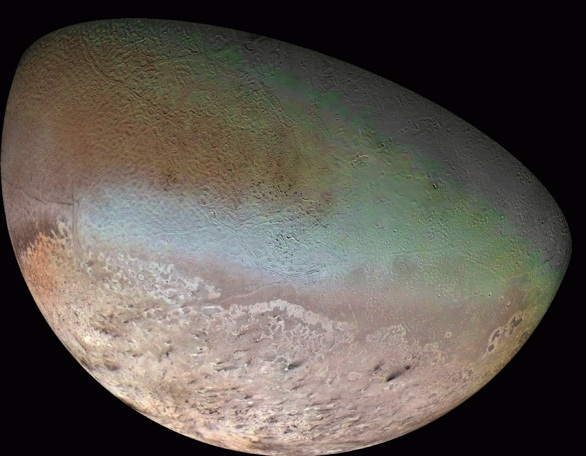 Tritón está marcado por enormes grietas. Las imágenes de la Voyager 2 mostraron erupciones similares a géiseres activos expulsando gas y partículas de polvo oscuro a varios kilómetros de la atmósfera.