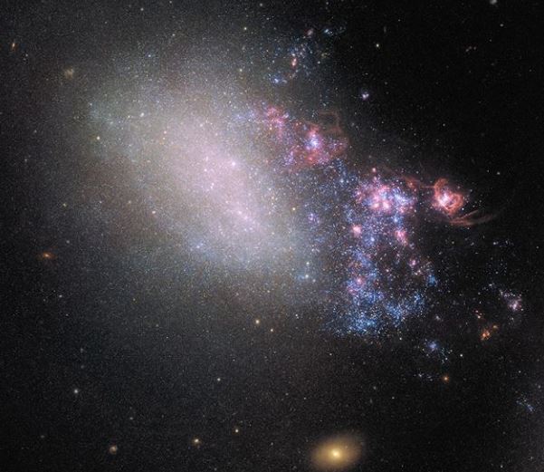 • Galaxias enanas: Son más pequeñas y menos masivas que las galaxias regulares. Pueden ser elípticas o irregulares y suelen orbitar alrededor de galaxias más grandes. A pesar de su tamaño reducido, muchas galaxias enanas tienen áreas de formación estelar activa. La baja masa y densidad de estas galaxias a menudo facilita la formación de estrellas en sus regiones más pequeñas y concentradas. Enanas del Grupo Local: Algunas galaxias enanas notables están cercanas a nuestra Vía Láctea, como las Nubes de Magallanes (Gran y Pequeña Nube de Magallanes), la Galaxia de Sagitario y la Galaxia Enana de Sculptor.