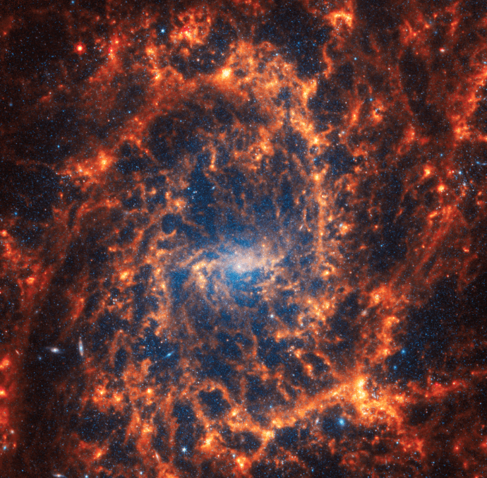 La cámara de infrarrojo cercano (NIRCam) del Telescopio Espacial James Webb revela un impresionante panorama estelar, donde millones de estrellas brillan en tonos azules, dispersas por los brazos espirales o agrupadas en cúmulos. Los datos del Instrumento de Infrarrojo Medio (MIRI) destacan el polvo brillante, revelando la formación de estrellas encerradas en gas y polvo. Las imágenes también revelan grandes capas esféricas en el gas y el polvo, posiblemente creadas por estrellas que explotaron, abriendo agujeros en el material interestelar