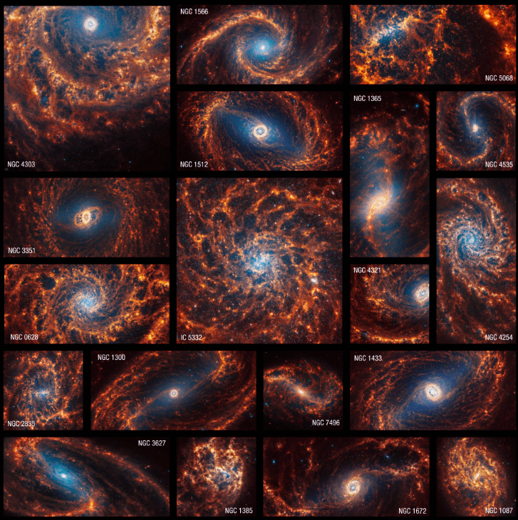 Las contribuciones únicas de Webb en el espectro infrarrojo han añadido nuevas piezas al emocionante rompecabezas cósmico que PHANGS ha estado construyendo a lo largo del tiempo. Os dejamos en la siguiente composición algunas de esas galaxias.