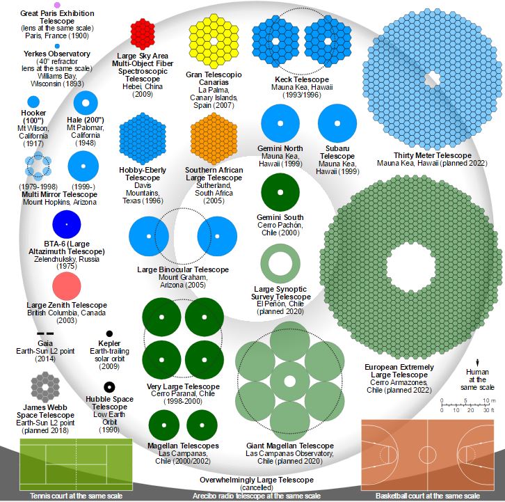 El mayor telescopio óptico del mundo, llamado el ELT (Telescopio extremadamente grande) está siendo construido en Chile. Tendrá un espejo principal de 39 metros y será el mayor telescopio óptico / infrarrojo cercano de la historia.