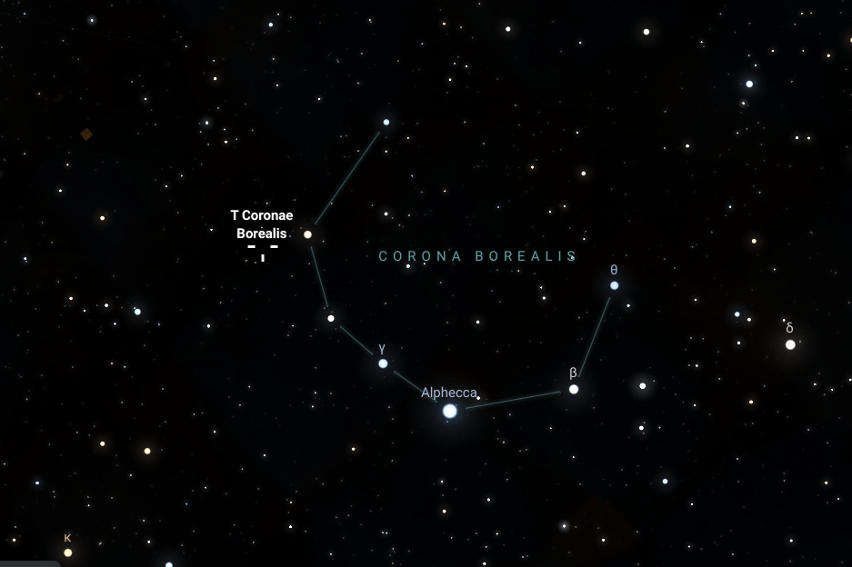 Si los cálculos de los astrónomos son acertados, una constelación muy conocida podría transformar su apariencia de manera breve en el transcurso de 2024. Todo indicaría que una nova volverá a iluminar la región. La estrella en el epicentro de este fenómeno es T Coronae Borealis, también reconocida como ‘Blaze Star’ o T CrB. Situada en la esquina de la constelación Corona Borealis o Corona del Norte, T CrB por lo general exhibe una magnitud inalterada de +10, apenas perceptible con prismáticos… pero cada 60 años, la estrella experimenta un estallido, elevándose momentáneamente a una magnitud alrededor de +2, de segunda magnitud, visible a simple vista.