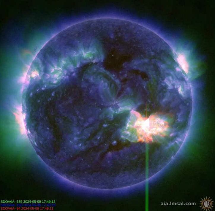 La llamarada solar alcanzó su punto máximo a las 1:44 p.m del día 9 de mayo, un momento capturado por el Observatorio de Dinámica Solar de la NASA, que estudia el Sol incansablemente en busca de tales eventos. Esta observación resultó en una imagen compuesta del Sol en tres colores distintos: azul, verde y rojo. En esta imagen, la llamarada solar de clase X se destaca como un estallido brillante de luz blanca y roja, ubicado en la esquina inferior derecha del Sol, una exhibición deslumbrante de la fuerza y la belleza del cosmos: