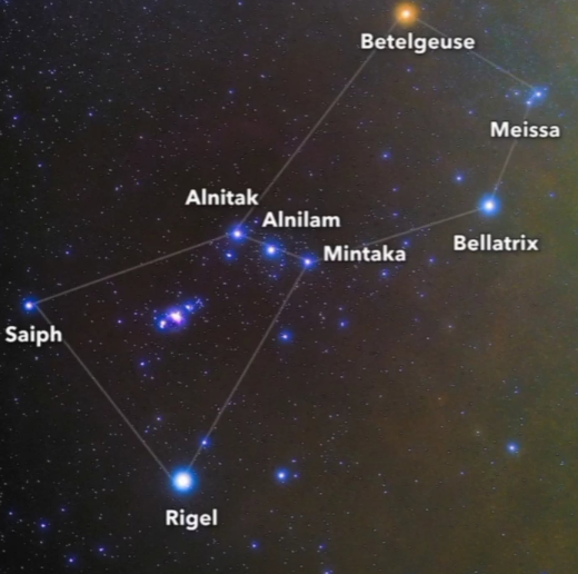 La grandeza de esta constelación se debe también a que se encuentra en una zona de intensa formación estelar, centrada en la fabulosa nebulosa de Orión. La Nebulosa de Orión (M42) compone la espada del Cazador, que pende de su cinto. Este cinturón está formado a la vez por una línea de tres estrellas muy brillantes conocidas como «las tres Marías», «los tres reyes magos» o, simplemente, «el cinturón de Orión». Estas tres estrellas son gigantes azules llamadas Mintaka, Alnitak y Alnilam.