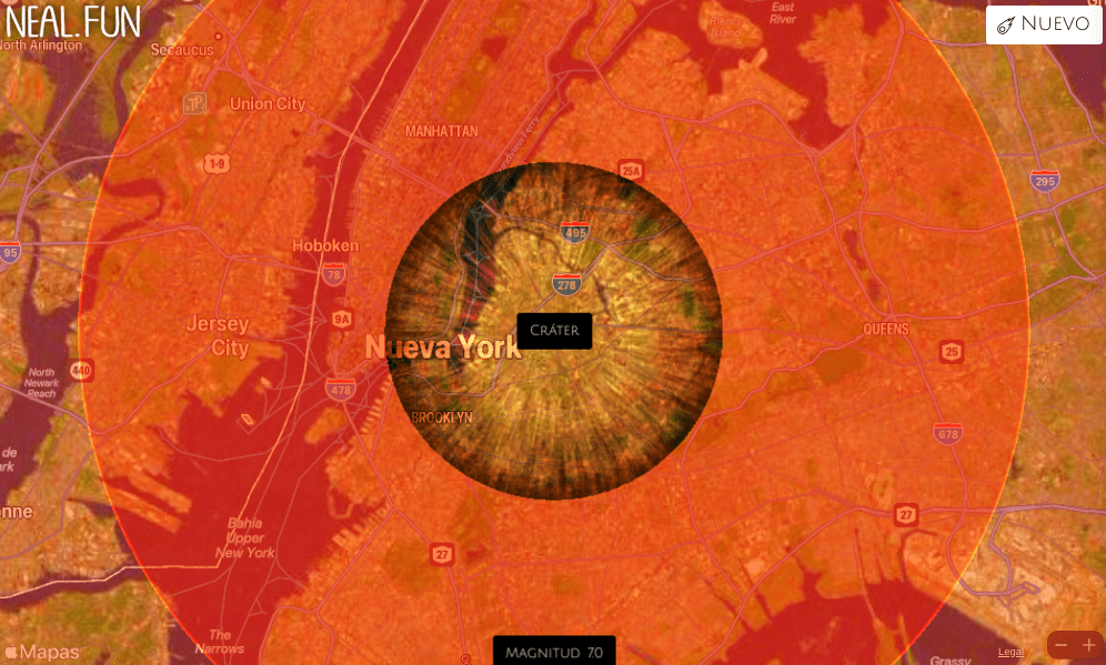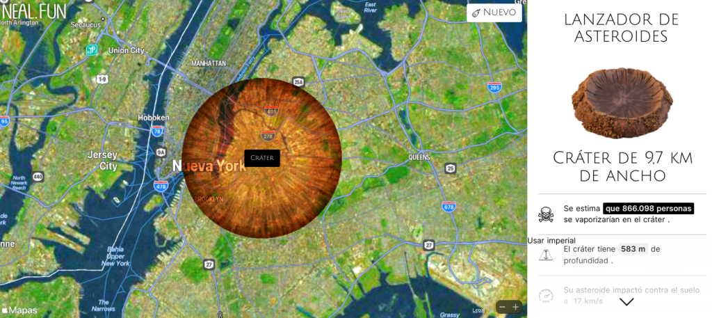 Hay una página muy sencilla e intuitiva para móviles u ordenadores que nos simula las consecuencias del impacto de un asteroide contra una ciudad. Se puede elegir la dimensión del asteroide y el lugar que queramos en un mapa de la Tierra donde quieras que impacte la roca.