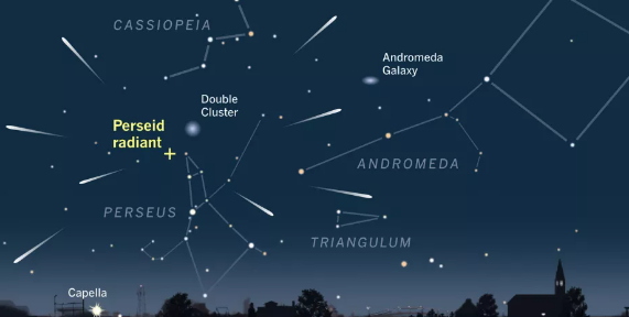 Ahora bien, cuando muchos meteoros se observan en una misma noche, y parecen provenir de una misma región del cielo, hablamos de una lluvia de meteoros. Esto ocurre cuando la Tierra atraviesa una corriente de meteoroides que sigue la órbita de un cometa o asteroide. El punto en el cielo del que parecen emanar los meteoros se llama radiante, y suele llevar el nombre de la constelación donde se encuentra: por ejemplo, las Perseidas (asociadas al cometa Swift-Tuttle) parecen emanar de la constelación de Perseo.