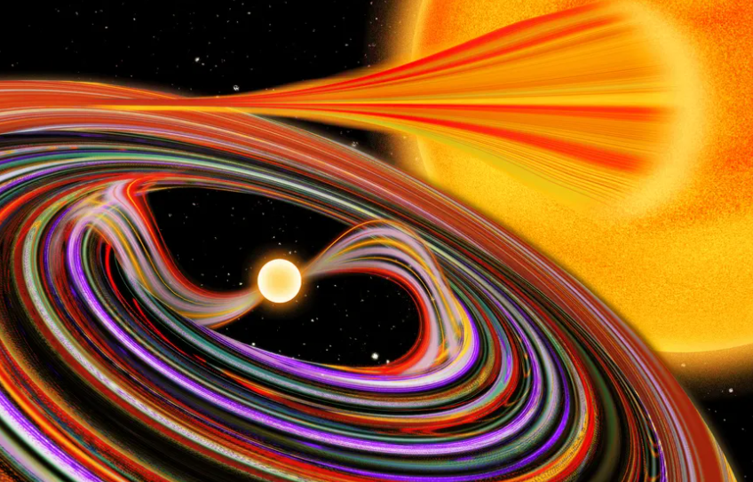 La diferencia de masas y de gravedad entre ambas provoca una situación muy particular. La gravedad de la enana blanca es tan intensa que arranca gas de su estrella compañera. Ese gas no cae directamente, sino que comienza a girar formando un disco de acreción, una estructura plana y caliente donde la materia pierde energía poco a poco antes de precipitarse sobre la superficie de la enana blanca.