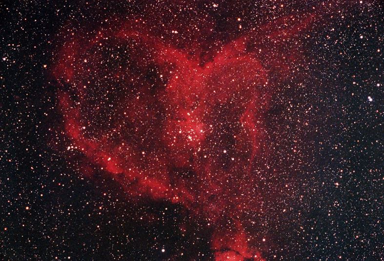 En el cielo profundo también hay espacio para el amor. Dentro de nuestra propia galaxia encontramos uno de los objetos más evocadores del firmamento: IC 1805, conocida popularmente como la Nebulosa del Corazón. Se trata de una extensa nebulosa de emisión formada por gas interestelar ionizado y densas nubes de polvo cósmico, situada a unos 7.500 años luz de distancia en el brazo espiral de Perseo de la Vía Láctea.