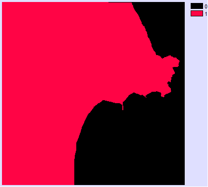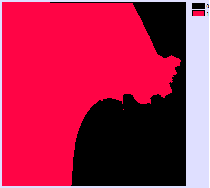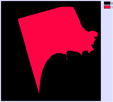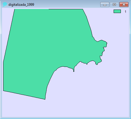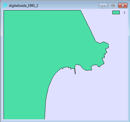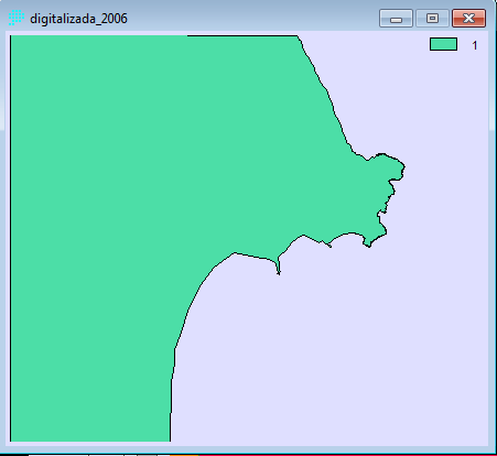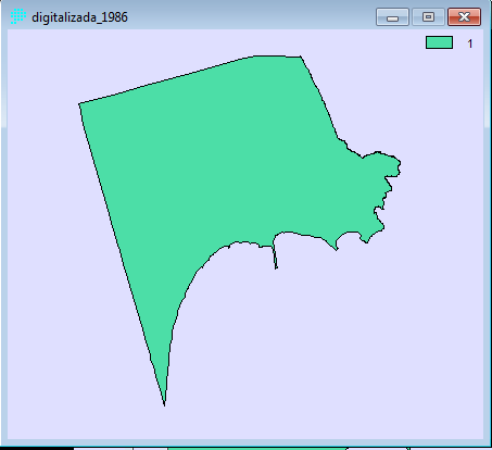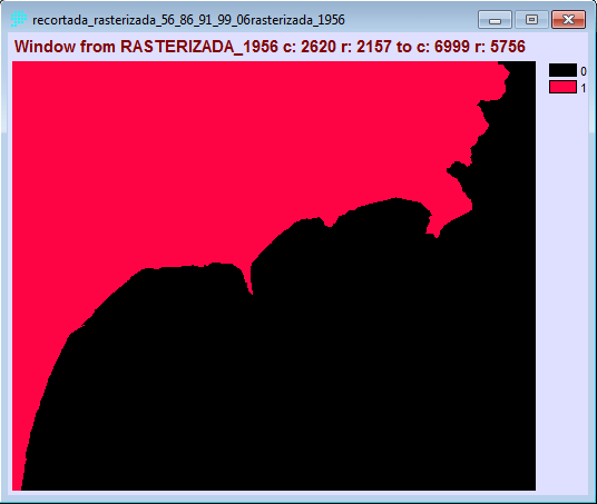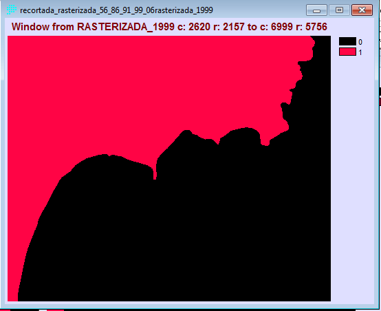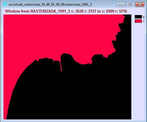 - Posteriormente digitalizamos las imágenes raster corregidas, primeramente creamos una imagen raster de valor 0 (Data Entry→INITIAL), creando una capa para impregnar la imagen digitalizada de valor 1. La digitalización de las imágenes la realizamos con REFORMAT→RASTERVECTOR, la opción de conversión la disponemos en raster to polygon. Las imágenes resultantes las ponemos a continuación: