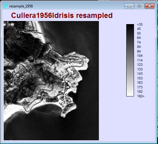 - Realizamos la corrección geométrica para las imágenes IRS_1999, Vuelo _1991, Vuelo_1986, Vuelo_1956. La Orto_2006 no realizamos ninguna corrección porque es la imágen que tomamos como referencia para corregir las otras. Las funciones del IDRISI que hemos escogido para esta acción es REFORMAT→RESAMPLE. En este punto escogemos la imagen a Corregir, entramos los parámetros de referencia de salida que es la Orto_2006, escogemos los puntos de control tanto a la imagen a corregir y de referencia, por lo menos unos 15 puntos de control GCP fueron escogidos en la demarcación de la línea costera y carreteras, tratando que el RMS sea lo menos posible no mayor a 2. Guardamos lo puntos de control para cada imagen corregida.