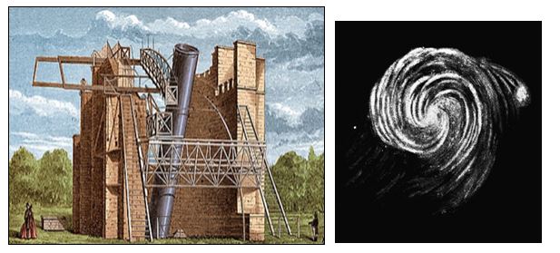 En el siglo XIX empezaron a construirse los grandes observatorios, así en 1845 el británico Willian Parsons construyó el telescopio reflector metálico más grande hasta el momento, el telescopio de Leviatán, de 185 cm de diámetro, 13 metros de longitud y colocado entre dos muros para protegerlo del viento y ganar en estabilidad. Con este telescopio descubrió la estructura en espiral de muchas galaxias, entre ellas M51: