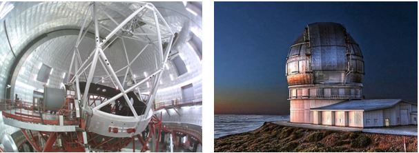 A partir de esta nueva tecnología los espejos están muy bien pulidos, tienen una gran reflectividad, colectan muy bien la luz y se pueden mover de forma individual, con lo que el conjunto de espejos se puede adaptar a las condiciones atmosféricas, es lo que se denomina óptica activa, obteniendo un gran calidad de imagen. Sistema que utilizan los grandes telescopios actuales como el GTC de La Palma (Gran telescopio de Canarias). Está ubicado a 2.400m de altitud en la isla de la Palma, tiene un sistema similar al telescopio Heck pero con un espejo primario de 36 segmentos hexagonales, que hacen un diámetro total de espejo de 10.4 m, lo soporta una montura altazimutal y es actualmente el  telescopio más grande del mundo. (Fig.12) También se pueden combinar telescopios para obtener grandes diámetros por lentes combinadas, como es el caso del VLT (Very Large Telescope) de Monte Paranal . Este es un sistema de cuatro telescopio de 8.2 m que usados en conjunto  equivalen al área colectora de un telescopio de 16m.