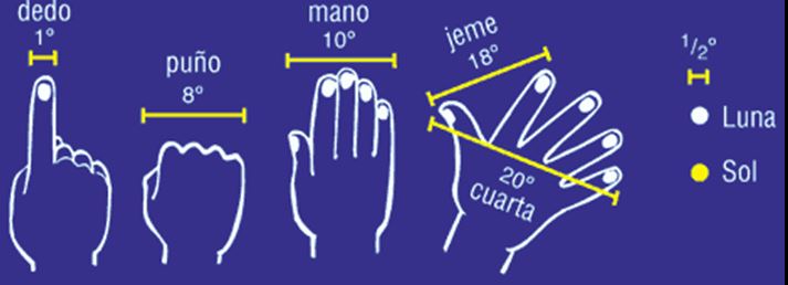 Como veis con un dedo podemos tapar el Sol y la Luna, ya que miden medio grado y nuestro dedo indice 1º. La mano abierta mide 20º de dedo a dedo, la Osa Mayor mide 25º, podemos comprobar que estirando el brazo hacia el cielo y abriendo la mano no podemos llegar a toda la Osa Mayor, por tanto sabremos que mide 20º seguro y un pico… los 5º que faltan.
